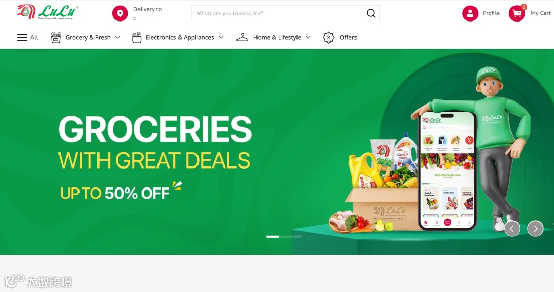Lulu Hypermarket是本土零售巨头Lulu的线上平台,月均访问量约280万,60%用户通过App下单,复购率达75%。主营食品杂货、家居日用品,支持30分钟速配或门店自提,2024年线上履约率达98.7%,远超行业平均水平。