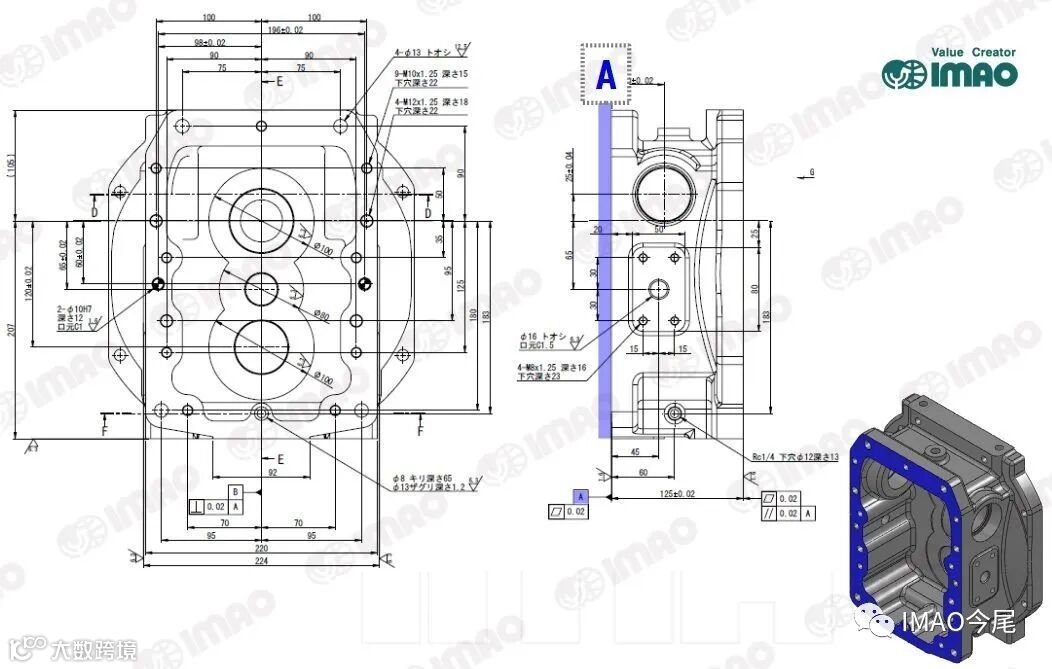 本工件需要加工 6 个面,所以判断就算使用卧式加工中心,也需要 2 个工序以上完成加工。接下来,需要找出需要较高加工精度的地方。