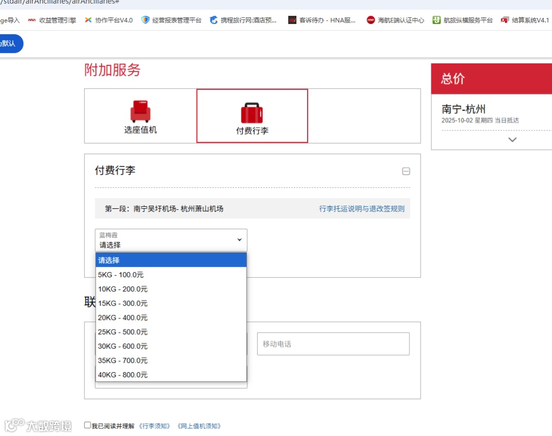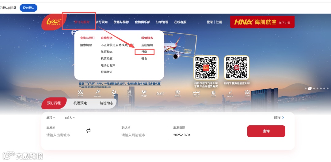 北部湾航空官网/官微/各个OTA平台→单独购买预付费行李额