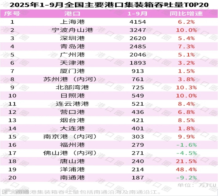 宁波舟山的增长率依旧令人羡慕,它在紧追不舍,吞吐量2025年预计或达3300万标箱,凭借深水优势与数字化码头,船舶日均靠泊艘次领跑全国。