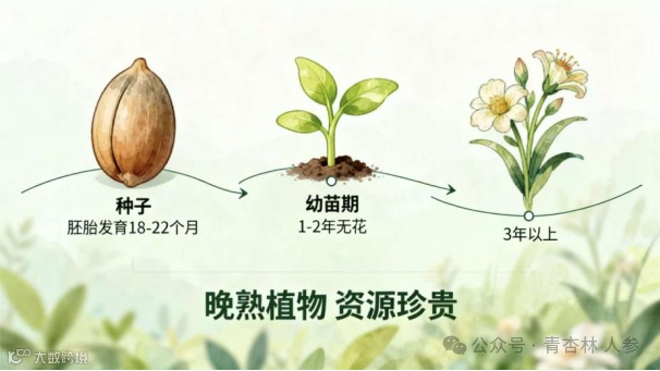 生长周期:人参种子需要经过一个温暖的胚胎发育期和一个低温的休眠期(约18-22个月)才能发芽。从发芽到第一次开花,通常需要3年以上。也就是说,一棵人参要生长很多年才有繁衍后代的能力,这也是野生人参资源珍贵且恢复缓慢的重要原因。