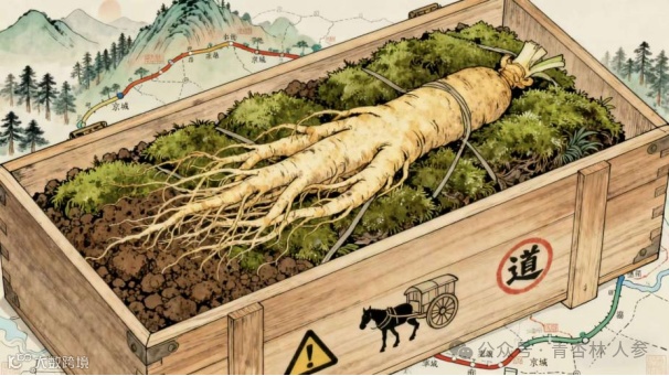 苔藓保活:新采挖的野山参会带着原坑的土壤,并用潮湿的苔藓层层包裹,再放入特制的木箱中。苔藓能保持湿润、透气,形成一个微小的原生环境,让人参在长达数月的运输途中依然保持“鲜活”,如同刚挖出来一样。这种方法体现了古人极高的智慧。