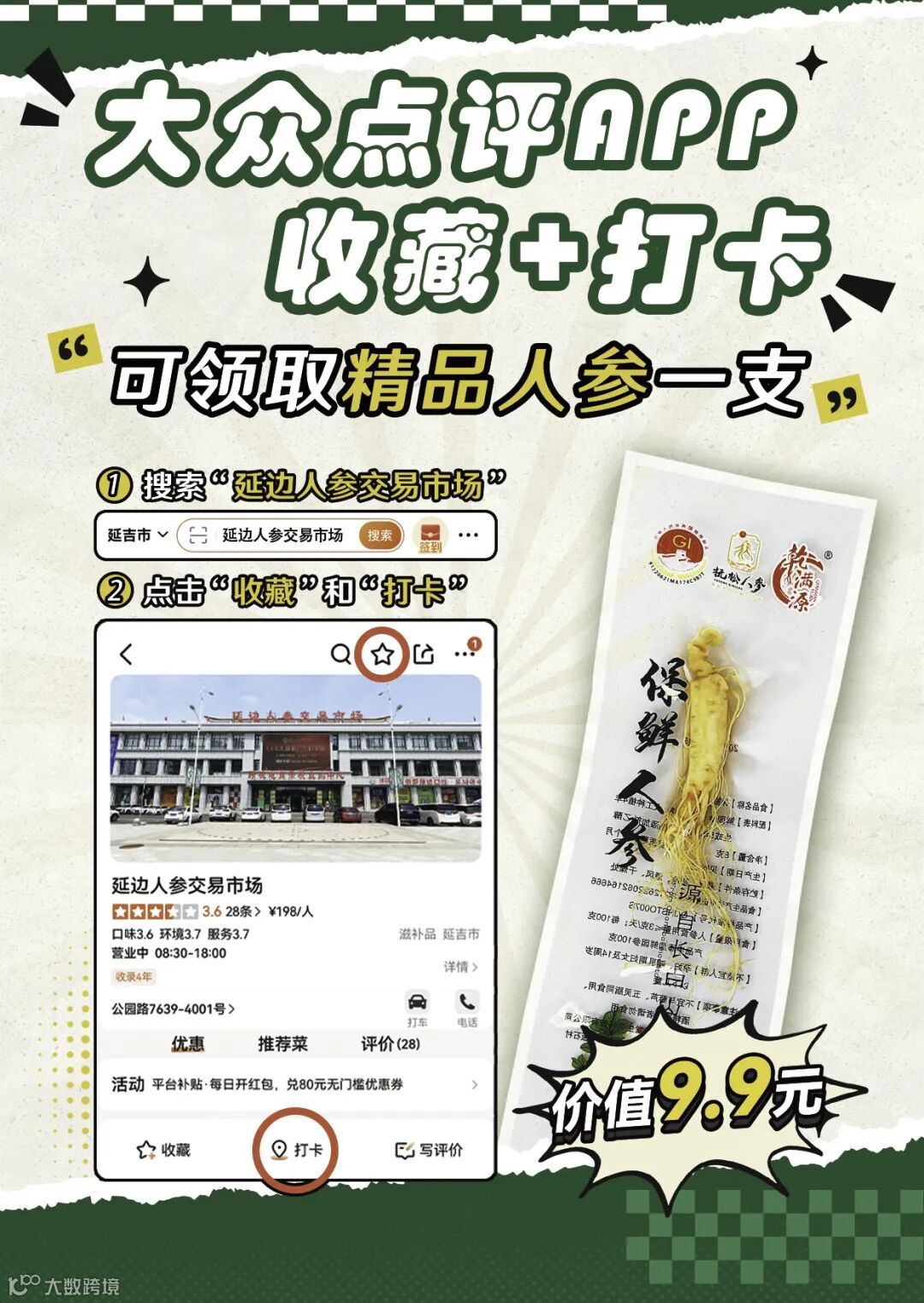 11月1日起,顾客在大众点评手机APP搜索“延边人参交易市场”