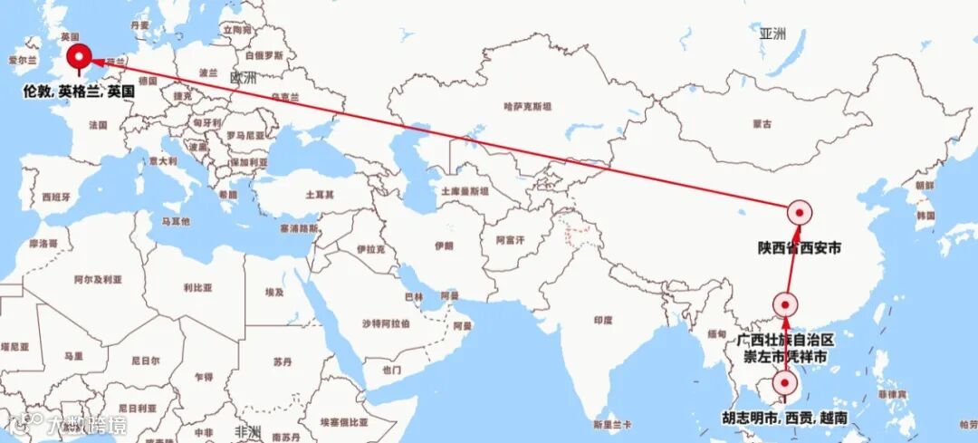 越南胡志明 → 北宁 → 中国凭祥 → 西安 → 英国伦敦(中欧铁路)