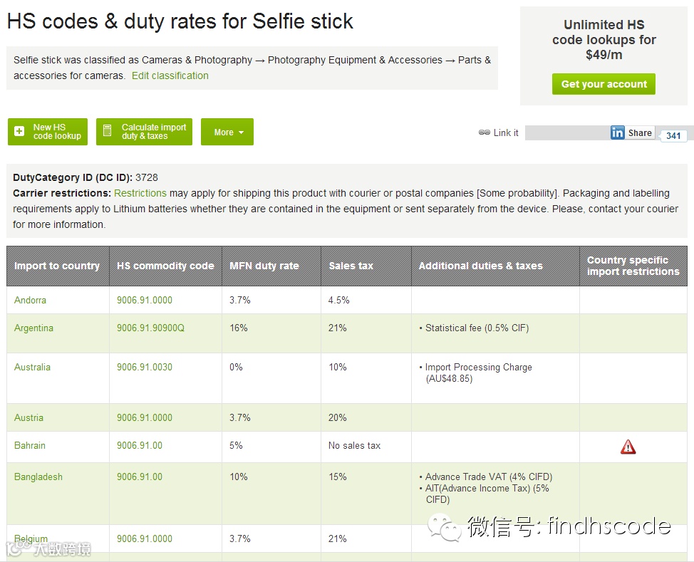 因此,目前主流观点认为,“自拍杆”应按照相机的“零件及附件”归入品目90.06项下。而且,在“DutyCalculator”网站中输入“selfie stick”也会跳出一长窜归入90.06的搜索结果(各个国家的都有)。