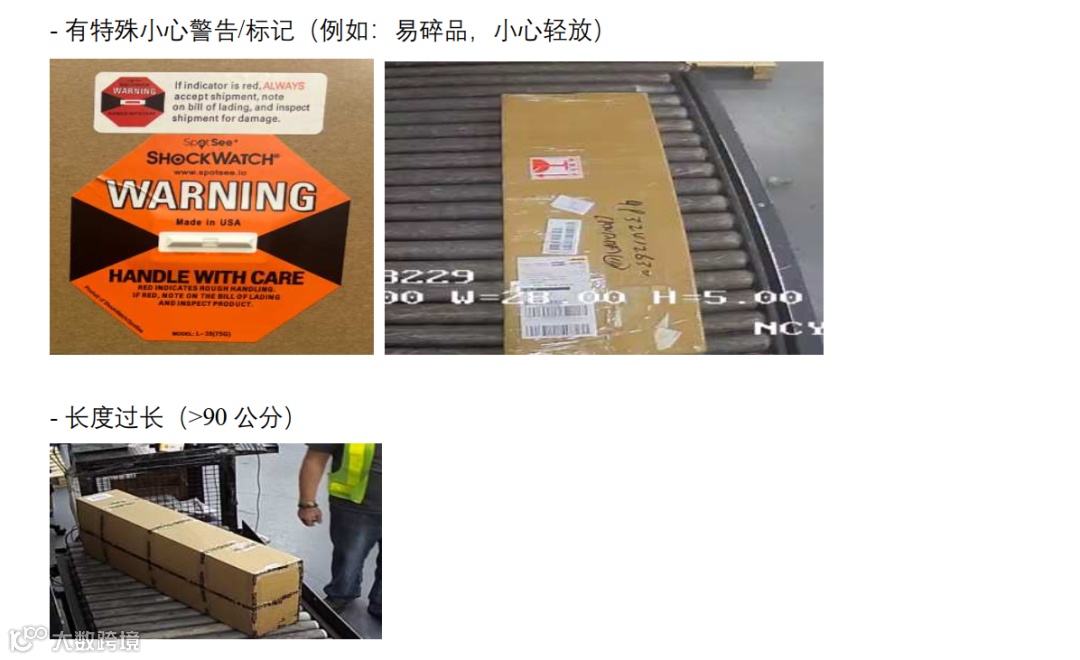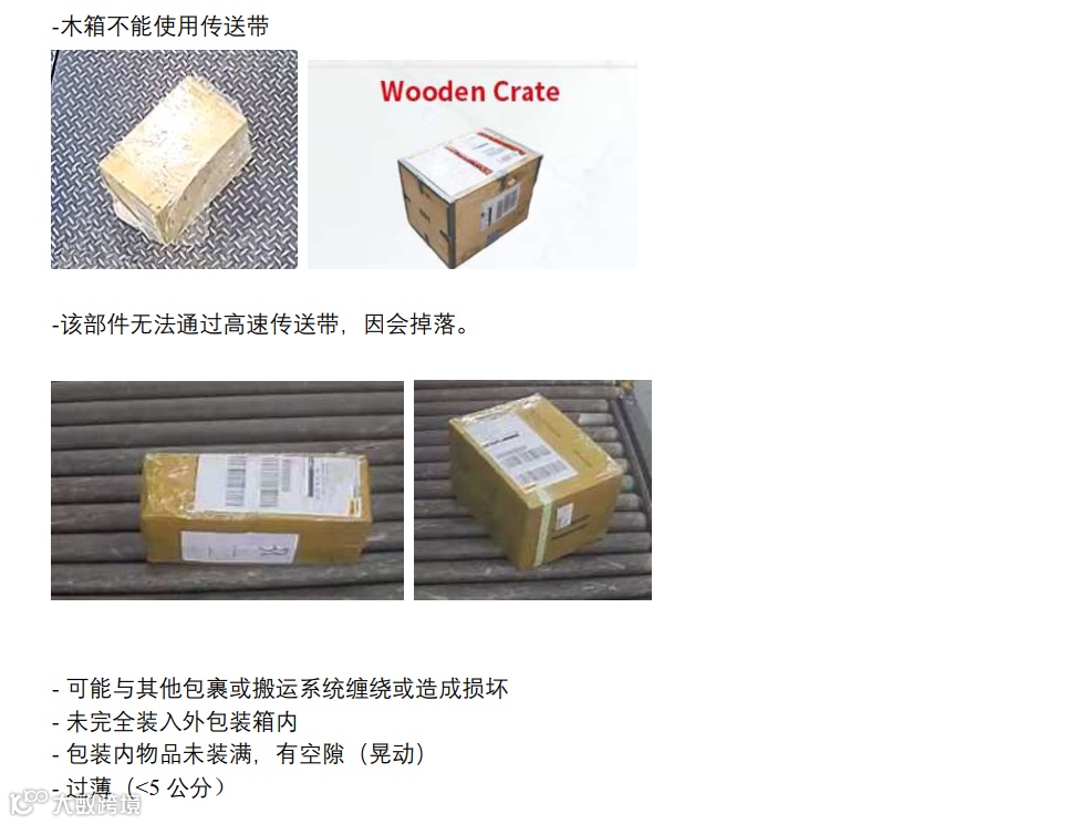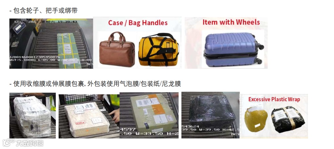 ②.非纸箱包装(晃动有空隙)/纸箱外面使用收缩膜或伸展膜或包装纸或编织袋/非四四方方的箱子(任何不规则包装)/包含轮子或把手或绑带/包装过软(形状太圆太胖);