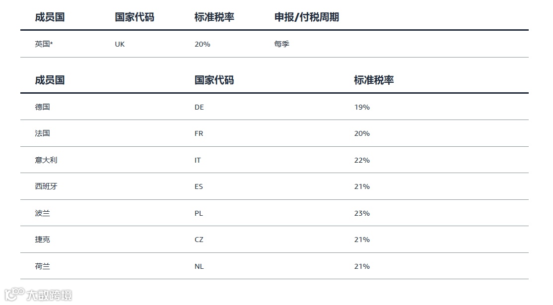 实际适用的增值税税率因不同的欧洲国家/地区(标准税率必须至少为 15%)和某些类型商品而有所不同。此外,某些欧洲国家/地区还为特定商品保留了其他费率。