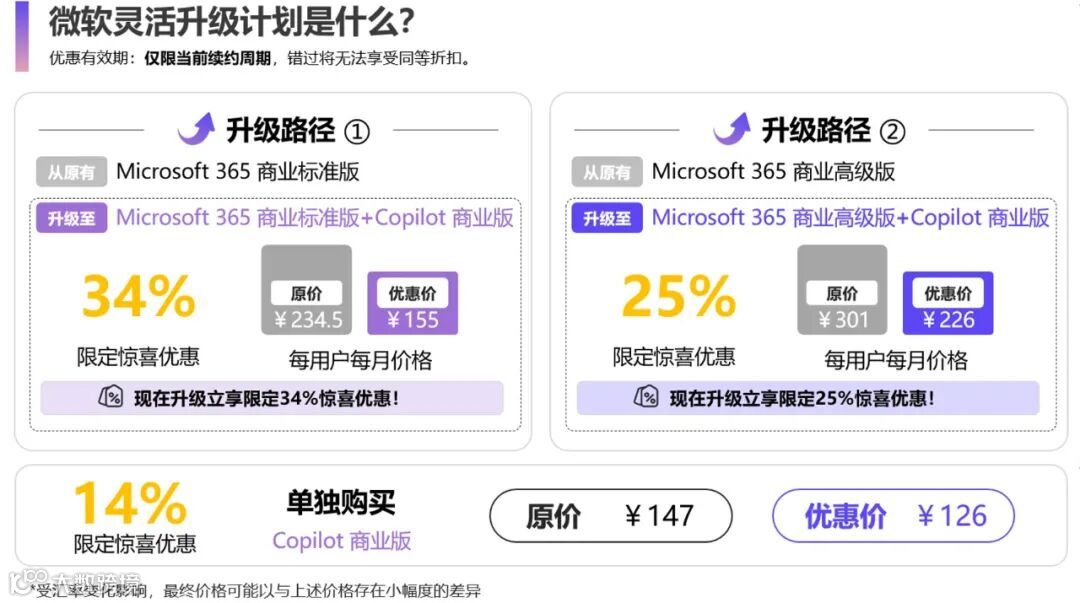 如果你或您的客户Microsoft 365 商业标准版 / 高级版许可即将在 2026 年 3 月前到期,或是有新的采购需求可别错过联强携手微软带来的「微软灵活升级计划」——限时 AI 升级方案:既能保障业务不中断,更能直接拿下 Copilot 智能助手,让办公效率翻番!