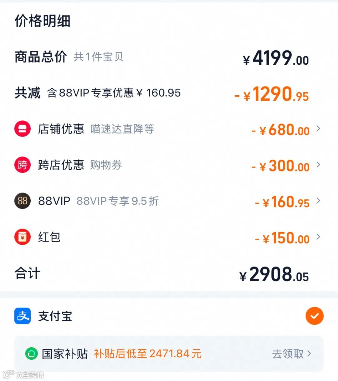 此次降价得益于多项优惠叠加:店铺直降500元、平台补贴180元,跨店满减300元,88VIP消费券抵扣150元,叠加88VIP会员9.5折再减160元,并享受国家补贴政策,最终到手价仅2471元。