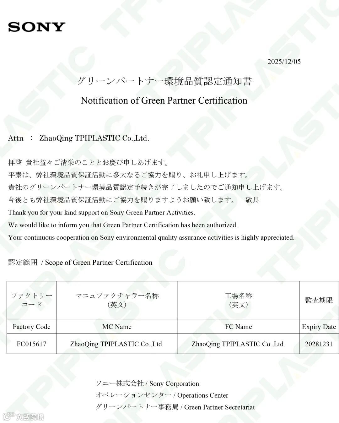 TPI深感荣幸能够成为 Sony Green Partner 体系的一员,这一举措标志着TPI在环保制造、资源循环以及绿色供应链管理等方面所做出的承诺与开展的实践。未来,TPI将秉持可持续发展理念,携手合作伙伴共同推进绿色创新,减少环境影响,为地球可持续发展贡献力量。