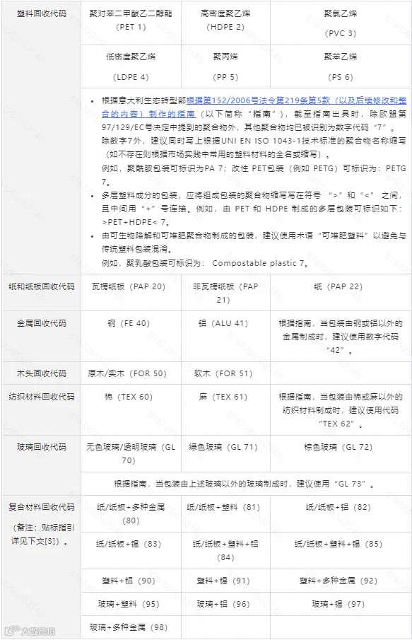 所有商品包装都必须根据欧盟第97/129/EC号决定,标注包装材料类型的字母数字代码;