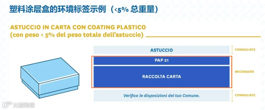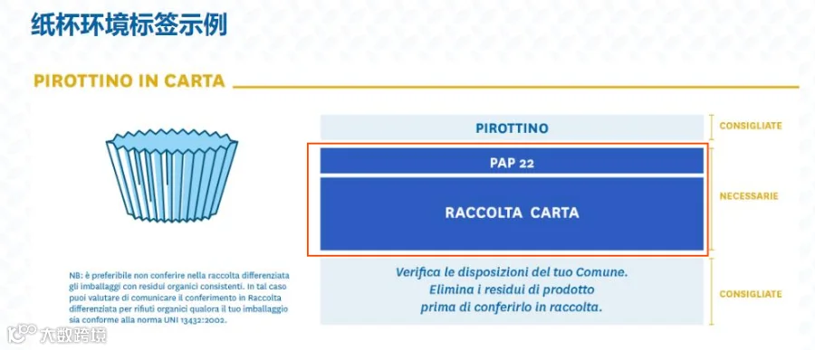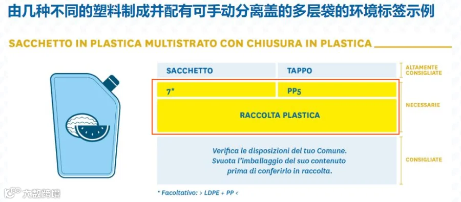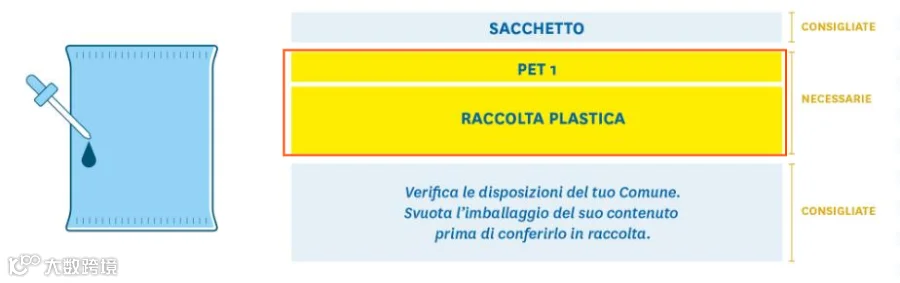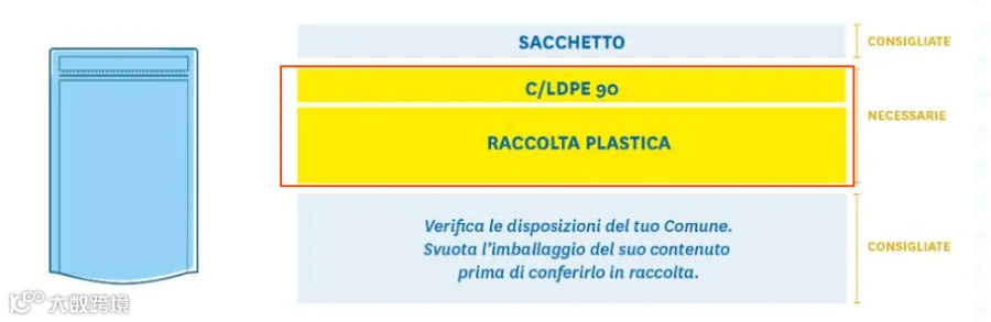 (2)材料类型+回收建议,例如“CARTA + Raccolta differenziata + Verifica le disposizioni del tuo Comune”(主要材料为纸,应单独收集,并要求消费者检查市政当局的规定)。
