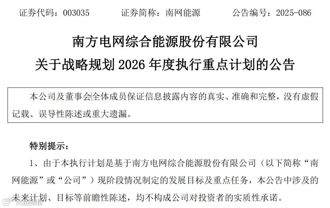 12月24日,南方电网综合能源股份有限公司(南网能源 003035.SZ)发布战略规划2026年度执行重点计划,瞄准“第五能源”节能服务市场需求和全国节能服务产业前景,锚定转型升级,优化核心业务布局,坚持“精益投资+高端服务”并重的转型方向,健全“投资+服务+产品”业务形式;聚焦工业节能和建筑节能两大业务基本盘,不再新增投资综合资源利用业务。拓展多能协同、零碳园区、交能融合、智能微网、虚拟电厂等业务,不再新增持有光伏等智慧绿电项目,制定资产持有策略和优化安排,推动由持有智慧绿电项目向多能协同与智慧运营转型。