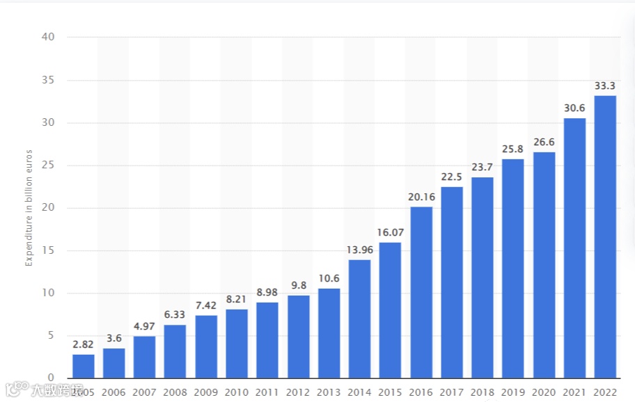 荷兰作为欧洲第7大电子商务市场,约有1400万在线购物用户。2022年荷兰电子商务产业价值333亿欧元,在线订单超过3.4亿个。
