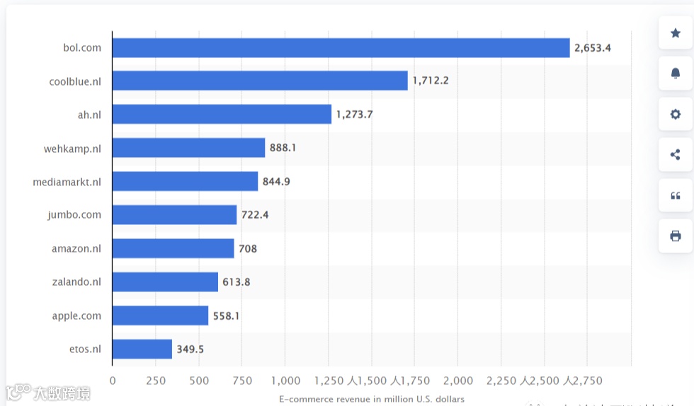 在荷兰的电商市场中,Bol.com 按销售营收位居榜首,第二则是电子产品零售商Coolblue,亚马逊仅排名第七。