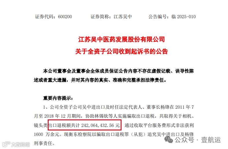 A股上市公司、江苏吴中医药发展股份有限公司(简称“江苏吴中”)此前发布公告,称其全资子公司江苏吴中进出口有限公司(以下简称“吴中进出口”)卷入了一起重大出口退税诈骗案,涉案骗取的退税金额高达2.4亿元,已有多名原高层被抓!