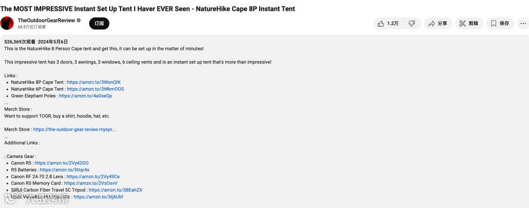 这对心水产品但又处在犹豫期的用户来说,是相当有分量的参考价值。因此,配合视频简介处留下的购买地址,本次合作对Naturehike带来的即时转化和长尾变现肯定都远超预期。