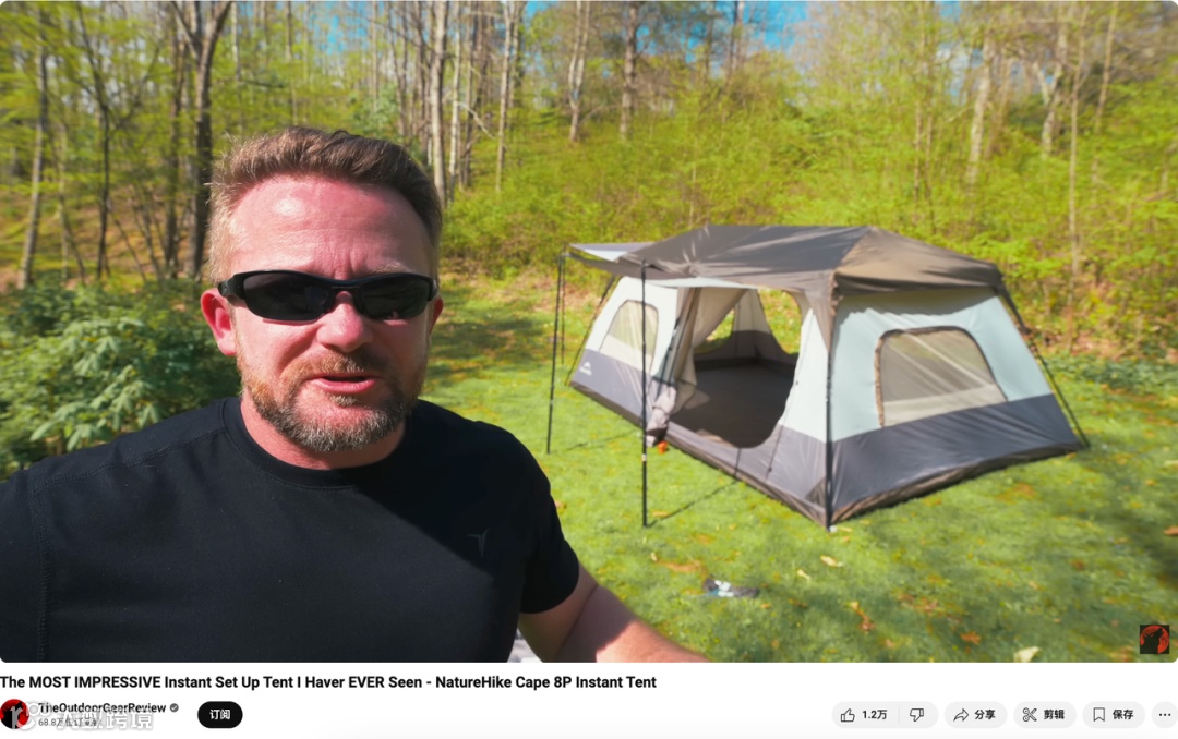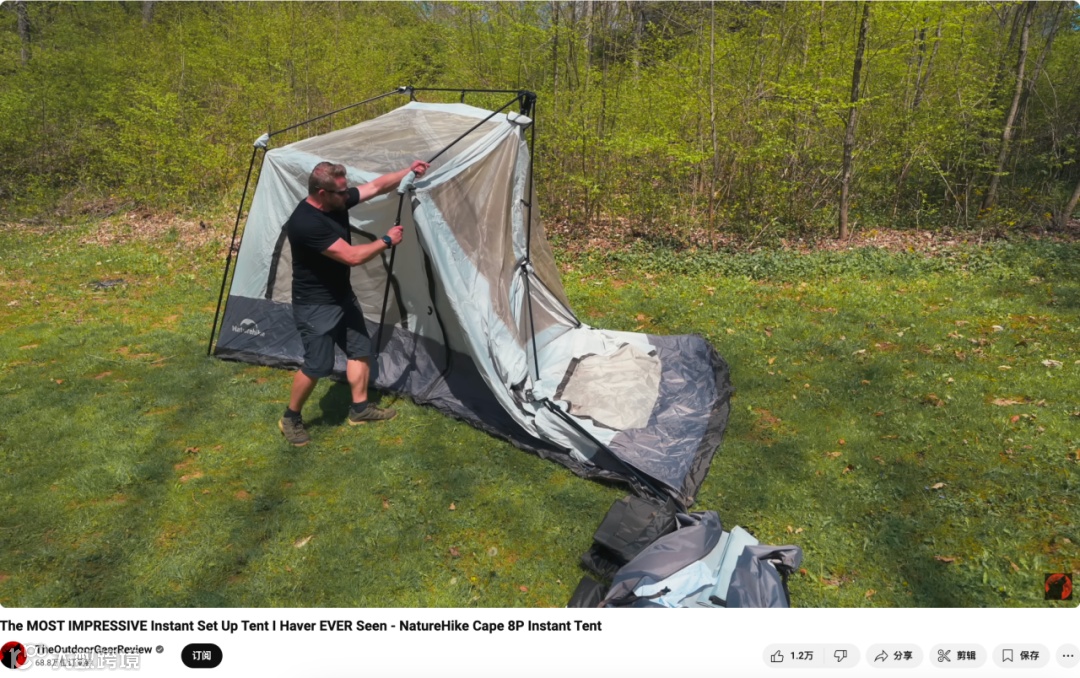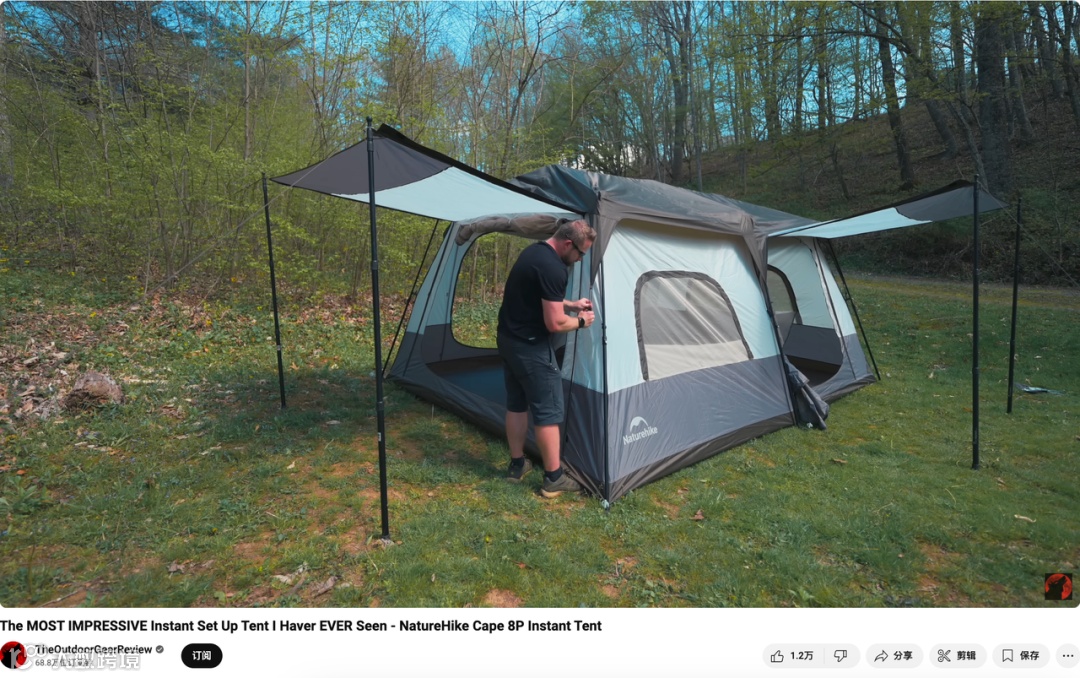 在具体的合作内容中,频道主持人向观众介绍了视频的主角——“NatureHike Cape 8P Instant Tent”,这是一款单人即可完成安装且最多可以容纳八个人的即搭帐篷。