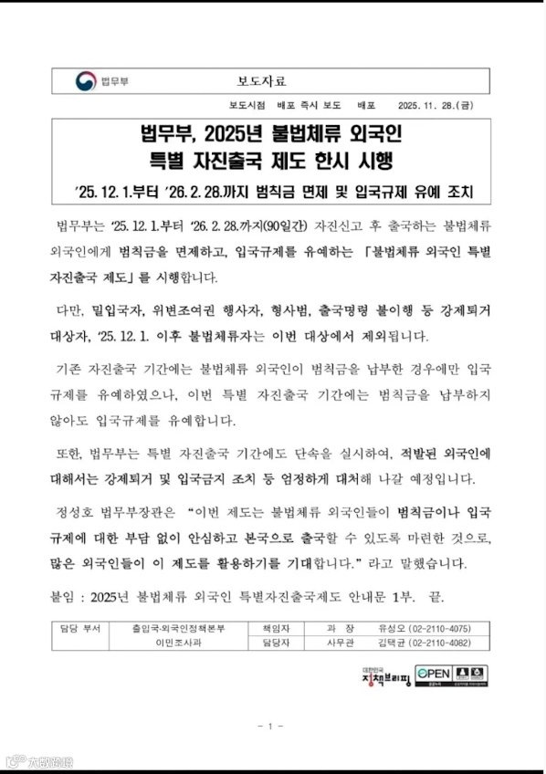 据韩网官方消息,韩国法务部将于2025年12月1日至2026年2月28日(共90天) 期间,对主动申报后出境的外国非法滞留者实施"非法滞留外国人特别自愿离境制度",免除其罚款,并暂缓入境限制。