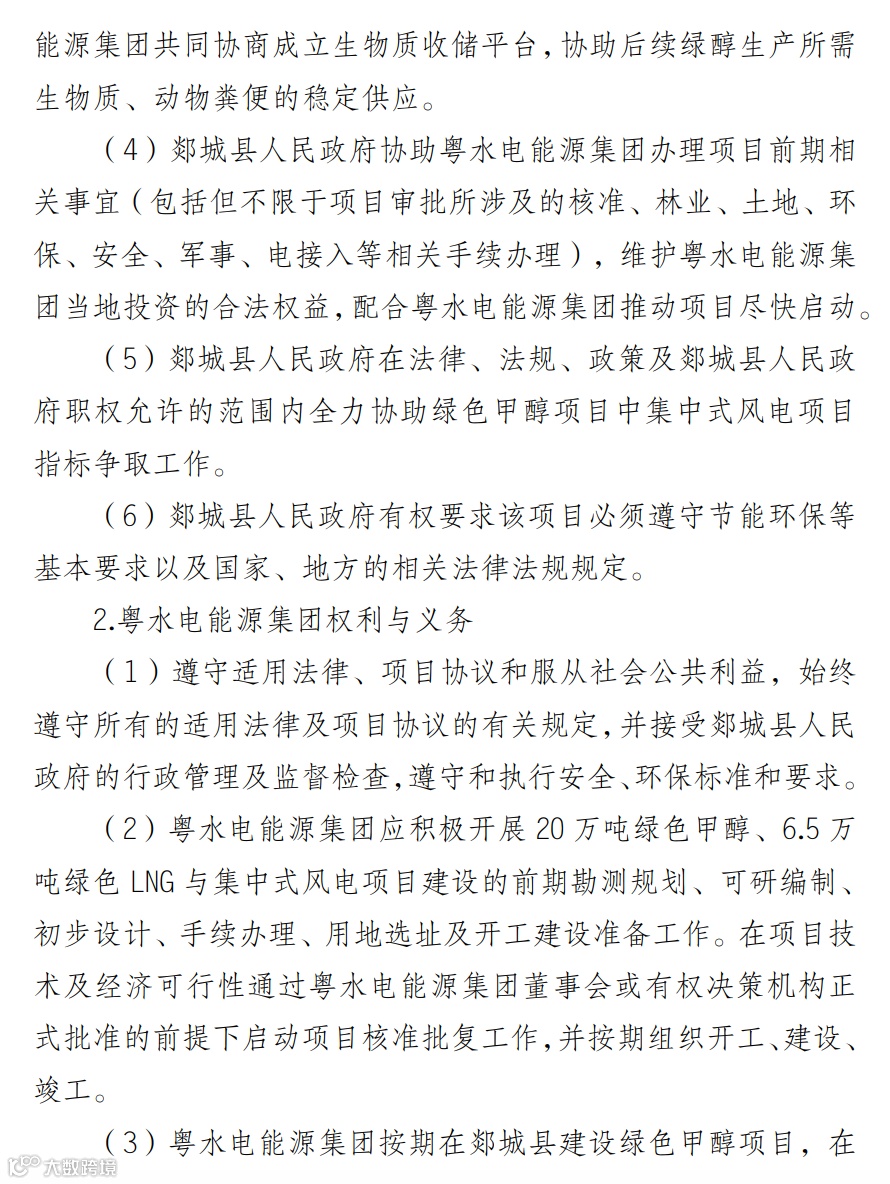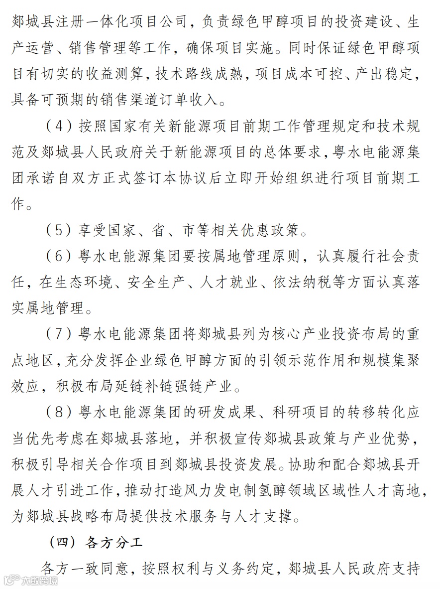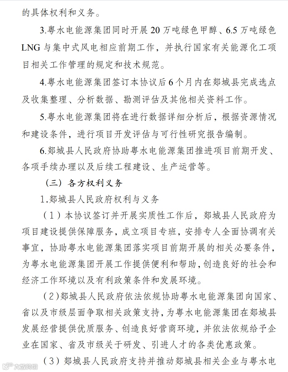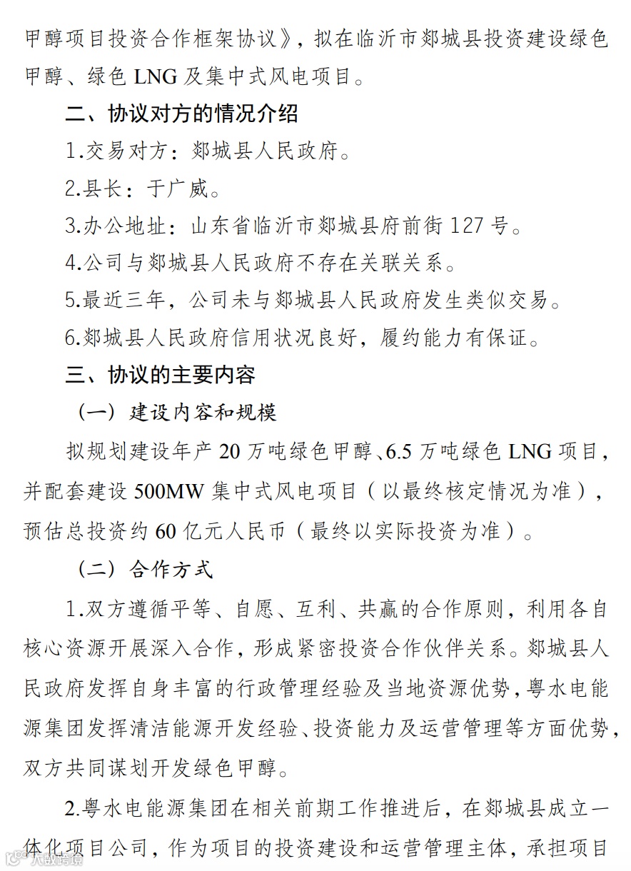 WindDaily获悉,12月26日,广东建工全资孙公司广东粤水电能源投资集团有限公司与山东省临沂市郯城县人民政府在临沂市签订《绿色甲醇项目投资合作框架协议》,拟在临沂市郯城县投资建设绿色甲醇、绿色LNG及集中式风电项目。拟规划建设年产20万吨绿色甲醇、6.5万吨绿色LNG项目,并配套建设500MW集中式风电项目,预估总投资约60亿元人民币。详情如下: