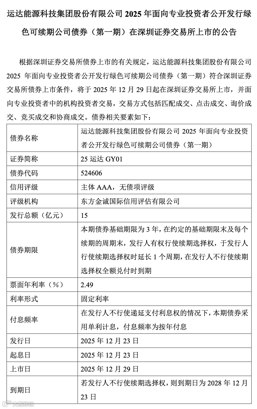 WindDaily获悉,运达股份近日在深交所成功发行首单绿色可续期债(第一期),募资15亿元。债券期限3+N年,募资将用于风电及新能源业务营运资金,优化负债结构。详情如下: