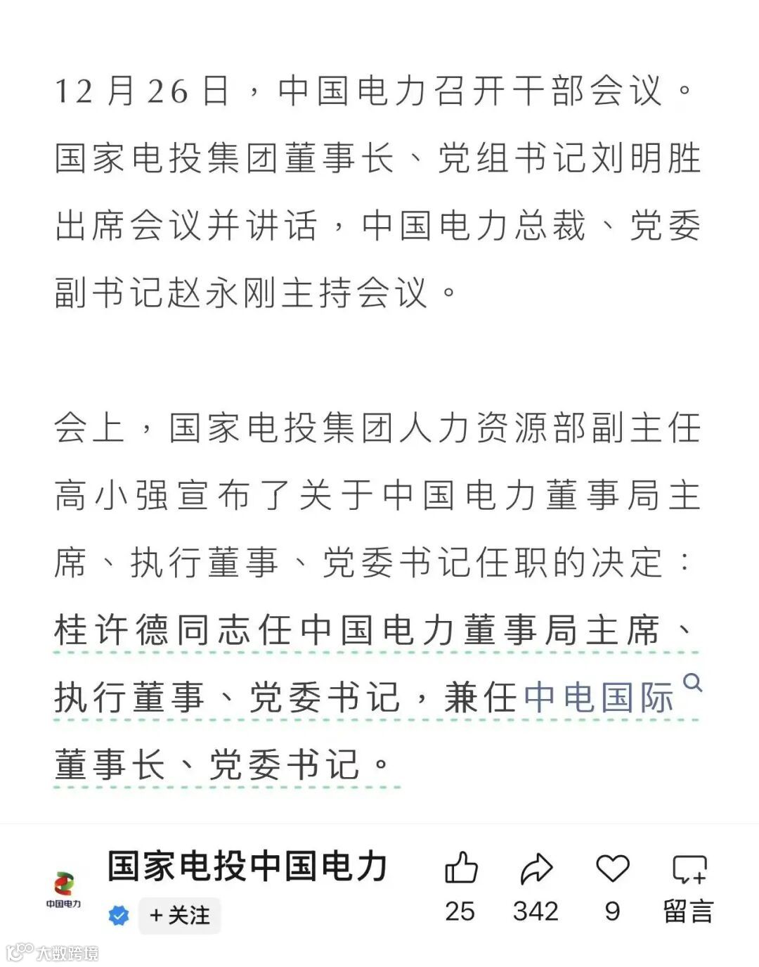 2月26日,国家电投体系人事调整落地:桂许德接任中国电力董事局主席、执行董事、党委书记,兼任中电国际董事长、党委书记,接棒调任国家能源集团副总经理的王子超。桂许德长期深耕能源领域,曾任三峡上海院董事长,2024年起任国家电投人资部主任,擅长产学研合作与人才建设,此次履新意味着这家风电开发商完成换帅。
