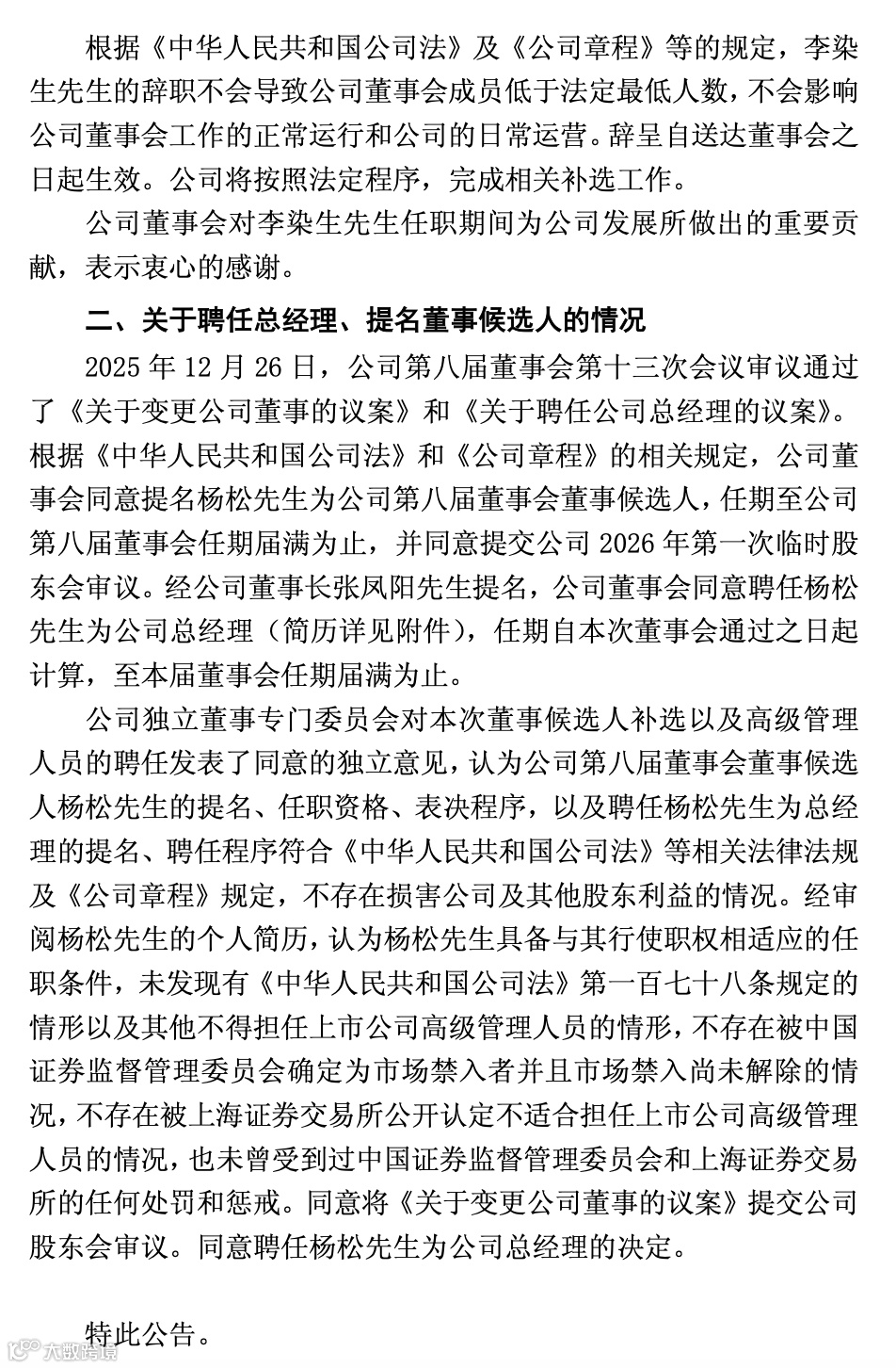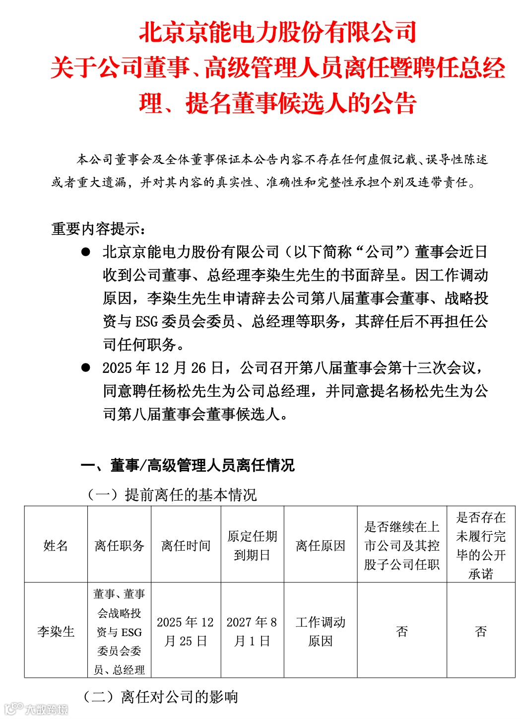 12月26日,京能电力宣布总经理人事调整:原董事、总经理李染生因工作调动辞职,辞任后不再担任公司任何职务;聘任杨松接任总经理,并被提名为本届董事会董事候选人,任期至本届董事会届满。杨松出生于1973年,高级工程师,拥有多年电力行业全链条管理经验,此前任京能集团经营计划部部长。