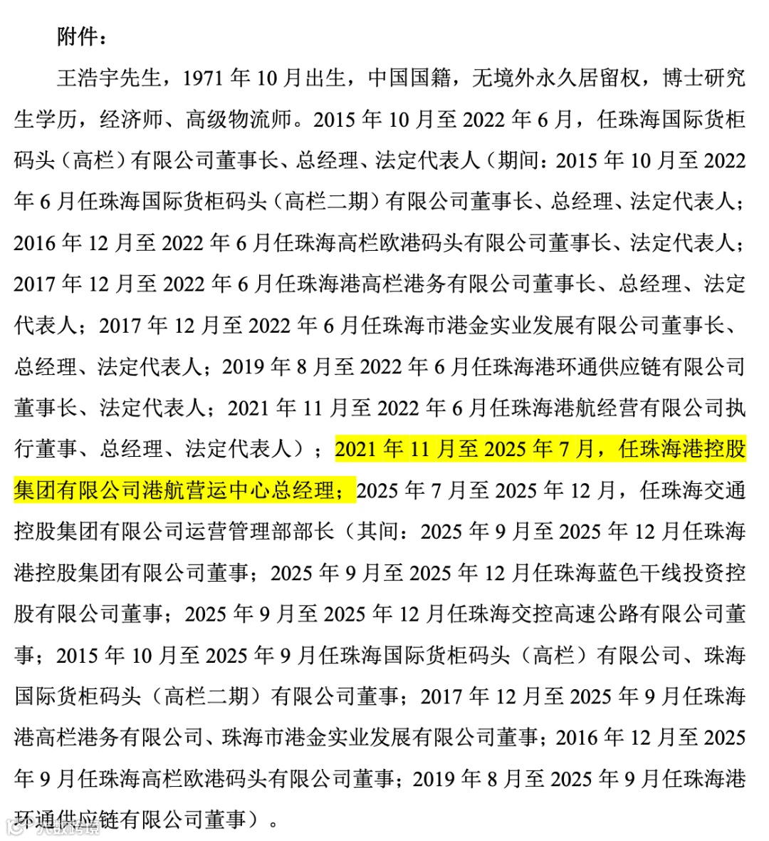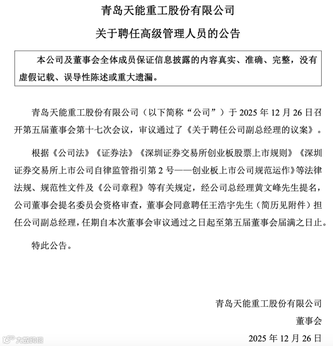 12月26日,天能重工宣布董事会审议通过高级管理人员聘任议案:正式聘任王浩宇为公司副总经理。王浩宇出生于1971年10月,博士研究生学历,持有经济师、高级物流师职称,具备深厚的国企运营与港口物流管理经验。其任职履历丰富,曾历任珠海国际货柜码头(高栏)有限公司董事长、总经理,珠海港控股集团港航营运中心总经理等核心管理职务,最新任职为珠海交通控股集团运营管理部部长。