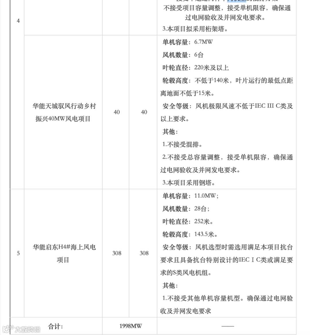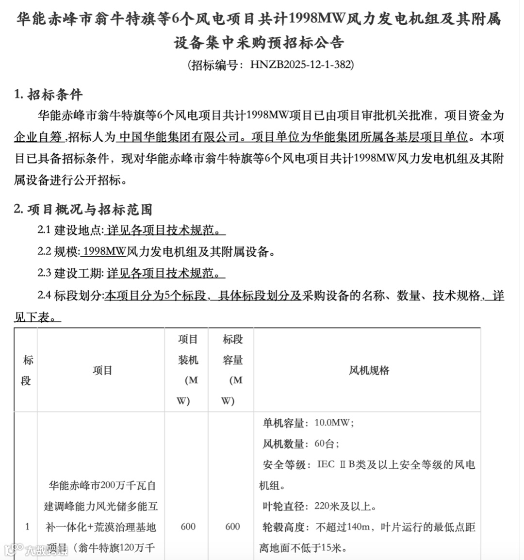 WindDaily获悉,华能赤峰市翁牛特旗等6个风电项目风力发电机组及其附属设备集中采购开启,采购规模为1998MW。本次集采分为5个标段,前四个标段为陆上风电,采购5-10MW风机;标段五为308MW海上风电,采购28台11MW风机。详情如下:
