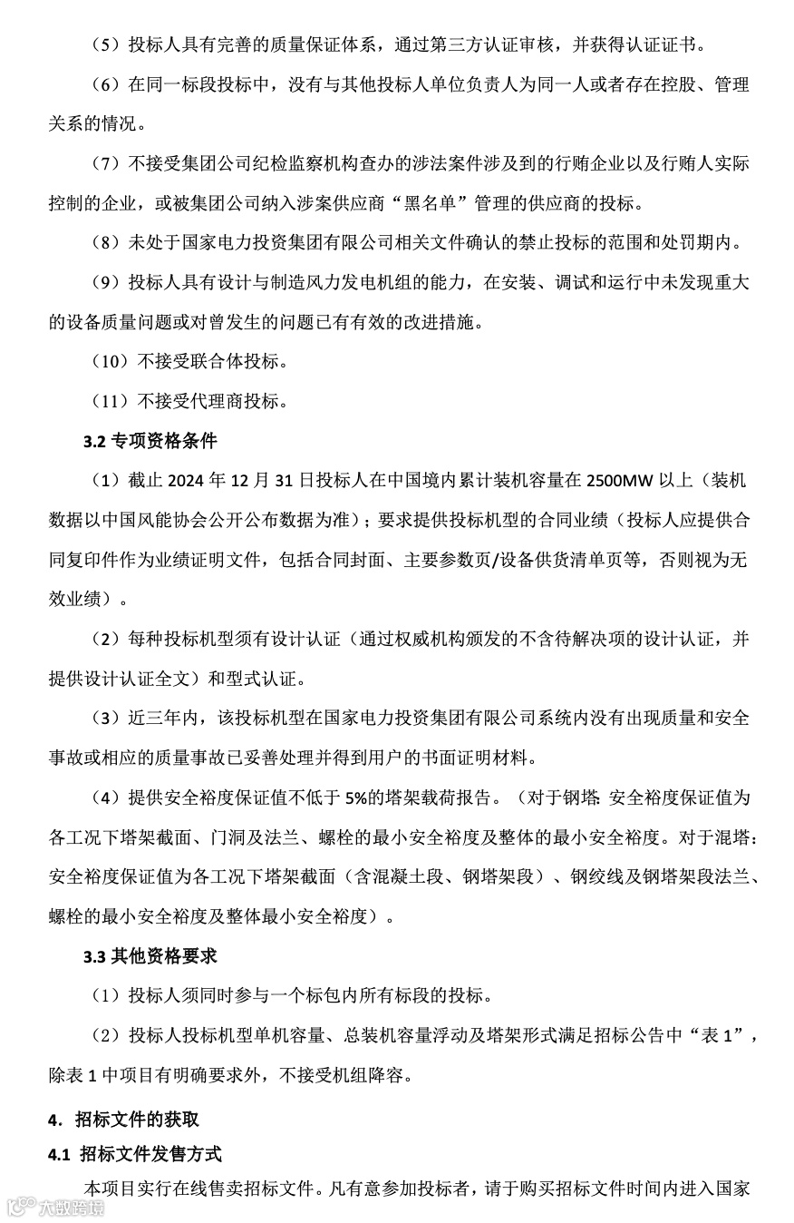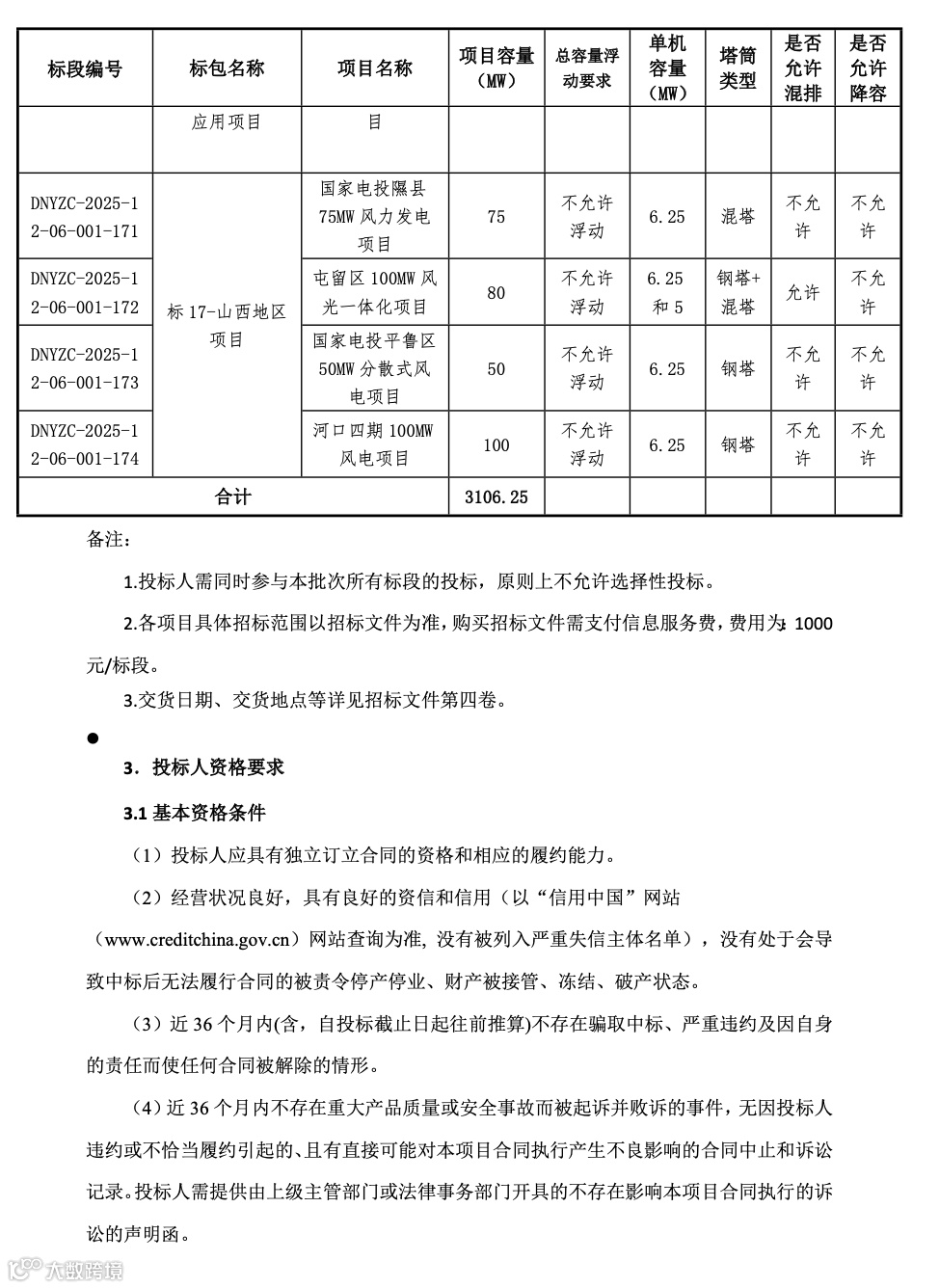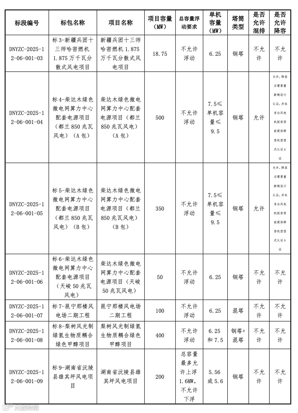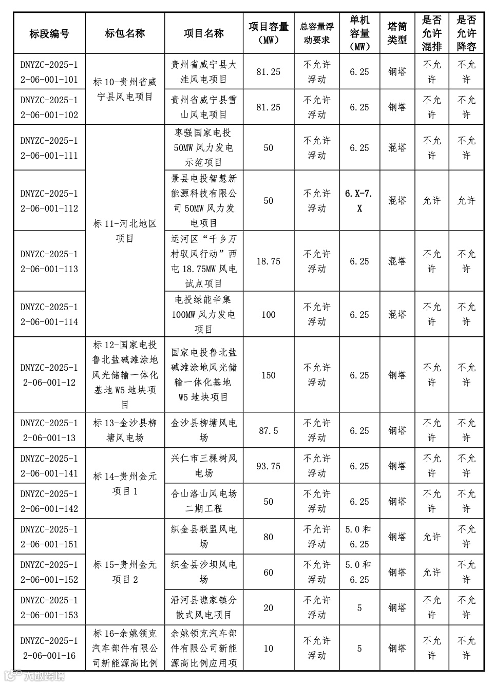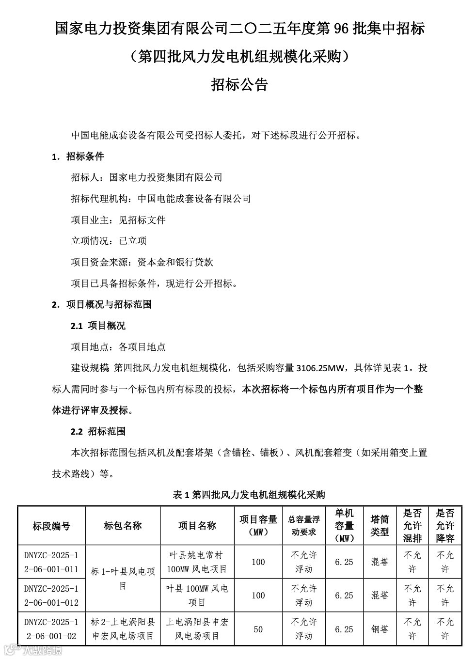 WindDaily获悉,国家电力投资集团有限公司二〇二五年度第96批集中招标(第四批风力发电机组规模化采购)开启。此次集采规模容量3106.25MW,分17个标段,单机容量6.25MW为采购的主力机型,最大功率不超过9.5MW。详情如下: