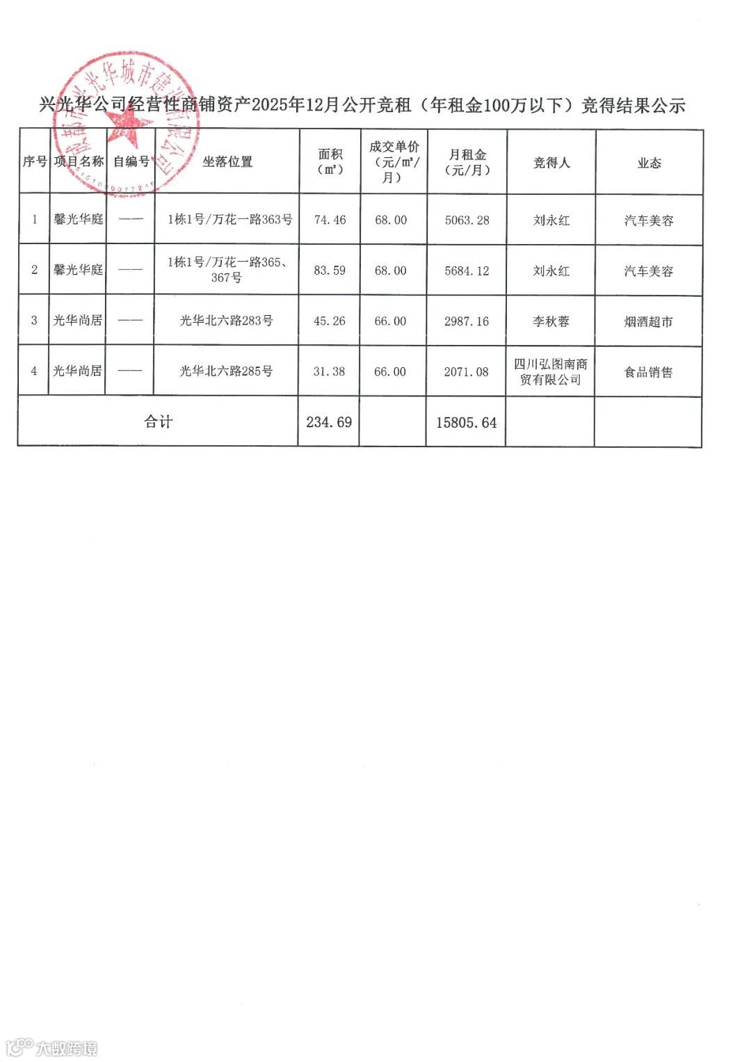 兴光华公司经营性商铺资产2025年12月公开竞租(年租金100万以下)竞得结果公示
