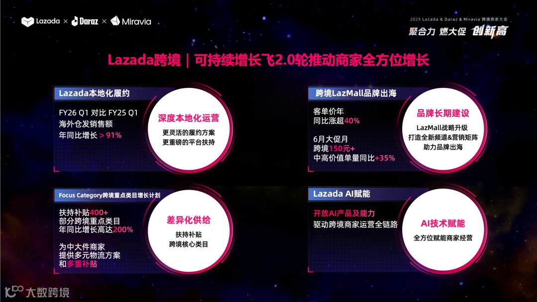 在深圳举行的 2025 Lazada & Daraz & Miravia 跨境商家大会上,Lazada跨境公布最新业务表现并推出面向下半年旺季的重点扶持计划。Lazada 4-6月本地履约商家销售额同比增长超 90%,6 月大促期间跨境中高价值订单(≥150 元人民币)同比增长超 35%,平台将以品牌、AI、深度本地化与全球化战略布局为四大支柱,提供更聚焦的资源与玩法,帮助商家加速海外增长。