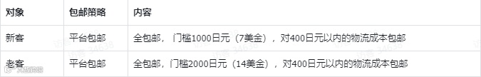 - 平台包邮覆盖新老客,门槛分别为1000日元与2000日元,物流补贴上限400日元