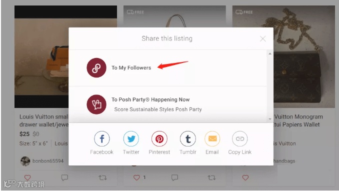 同时也支持用户将POSHMARK的商品分享至其他社交媒体,以吸引用户间互相关注,获取更多的流量和粉丝,提高商品出单率。