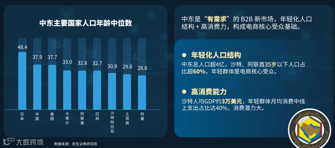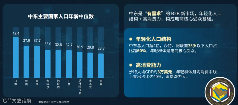 再加上 99% 的互联网普及率,中东市场兼具“年轻消费力 + 高进口需求 + 政策红利”,可谓跨境 B2B 的理想目标。
