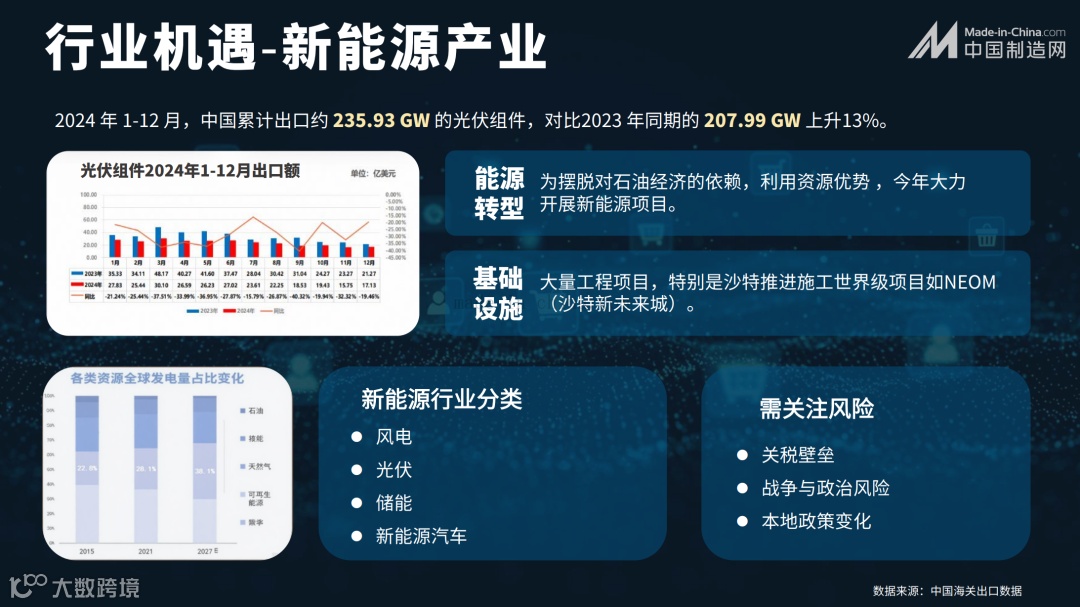 光伏、储能、新能源汽车需求猛增。2024 年,中国光伏组件出口增长 13%,尤其是沙特 NEOM 未来城这样的超级项目,对新能源设备需求旺盛。