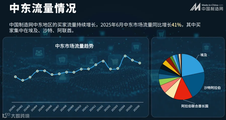 2025 年 6 月中东流量同比增 41%,埃及、沙特、阿联酋买家最集中,平台还会通过 Google、Facebook 定向引流。
