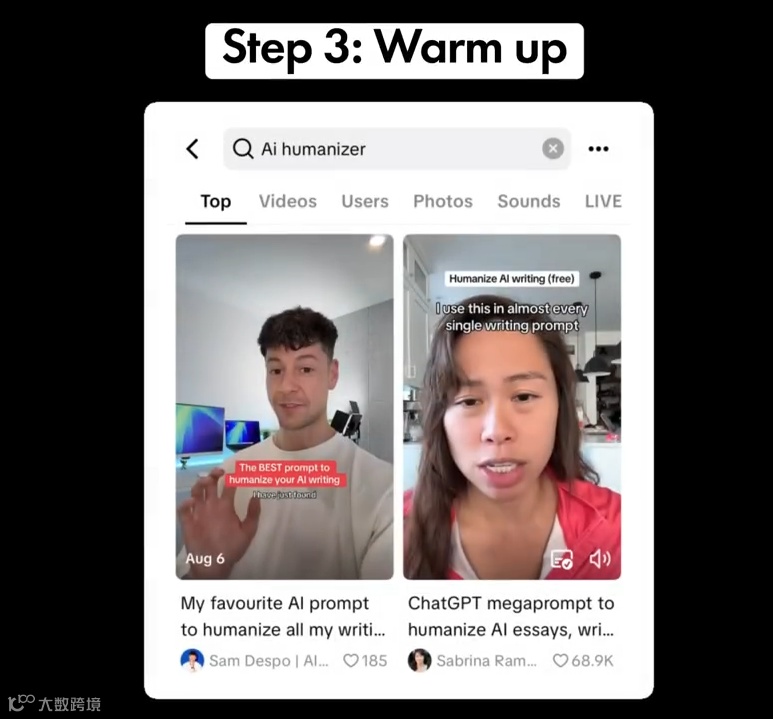 第一步,在开发产品前做市场调研,证明TikTok上有竞争对手,且他们有热门视频。用TikTok搜索和创作者洞察功能。