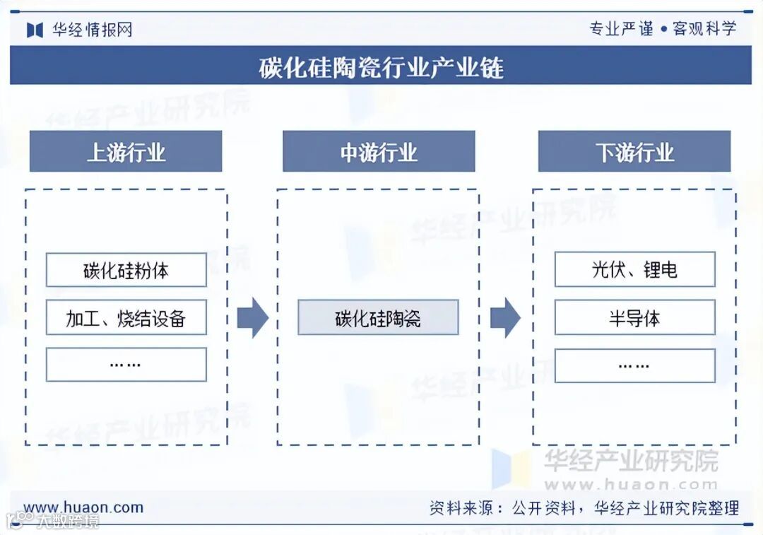从产业链看,碳化硅陶瓷上游主要包括碳化硅粉体、金属硅粉等原材料及粉体加工、成型、烧结等专用设备;中游涵盖成型、烧结、精密加工等制造环节;下游应用集中于光伏、锂电、半导体、化工等领域,广泛用于换热器、流化床、锟道窑等高温或腐蚀性环境设备。