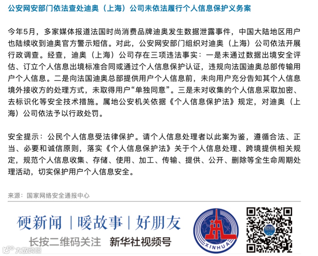 2025年5月,法国知名消费品牌迪奥在中国大陆运营中发生数据泄露事件,引发公安网安部门介入调查。经查明,迪奥(上海)公司存在多项违法事实:未经合规程序将中国用户信息跨境传输至法国总部;未履行“单独同意”义务,未充分告知用户境外数据处理方式;同时缺乏必要的技术保护措施,如数据加密与去标识化处理。