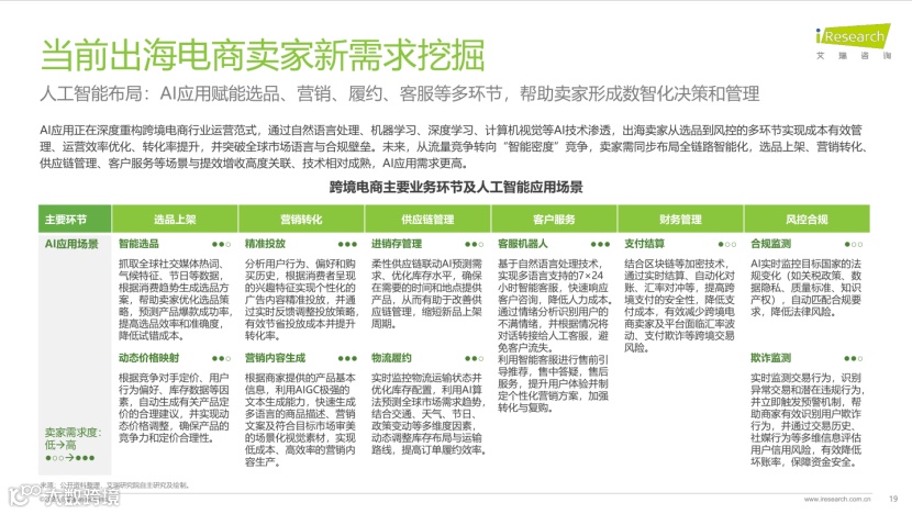 技术应用上,AI赋能全业务链路,从智能选品(抓取社交媒体热词生成选品方案)、精准营销(分析用户偏好实现广告个性化投放)到智能客服(7×24小时多语言响应),AI技术帮助卖家降低试错成本、提升转化效率,Gartner预测2029年60%中国企业将把AI融入核心产品服务,成为收入增长主驱动力;