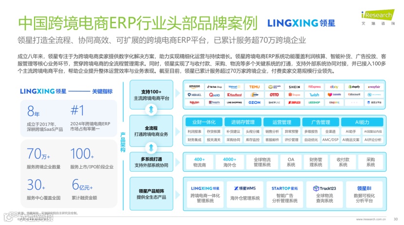 头部ERP厂商竞争优势显著,以领星ERP为例,其服务超70万家跨境企业,2024年付费卖家交易规模市场份额约26.6%,通过对接100+主流平台、400+物流商与4000+海外仓,为企业提供全流程数字化解决方案,大幅提升运营效率,如帮助企业缩短加工贸易账册变更时间超50%。