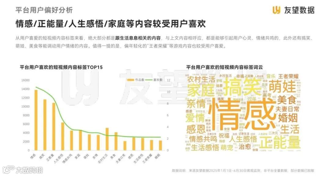 用户结构是关键驱动因素——35-55岁用户贡献了62%的活跃时长,更偏好能带来情感慰藉的内容。标签数据显示,“幸福正能量”“人生感悟”“夫妻日常”等生活化主题稳居用户喜爱榜前列。