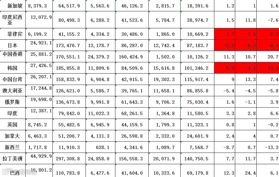 基本上所有市场都还比较好,除了非洲的市场下降了一些,南非下降的多一些。欧盟也下降了一些,但是不算特别多,总体来说外贸市场行情还不错。