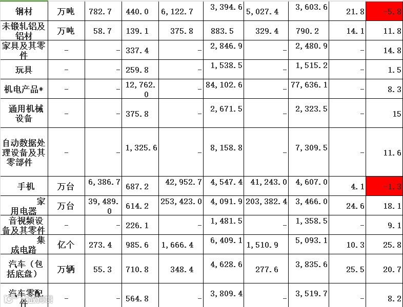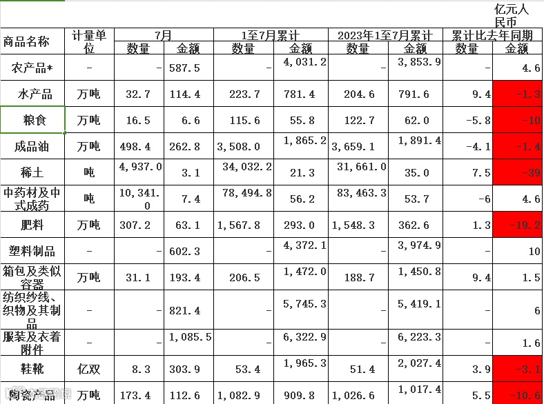 前7个月出口同期相比,机电产品占出口比重近6成,其中自动数据处理设备及其零部件、船舶、集成电路和汽车出口增长比较多。稀土、肥料、粮食、陶瓷、钢材等产品下降较多。