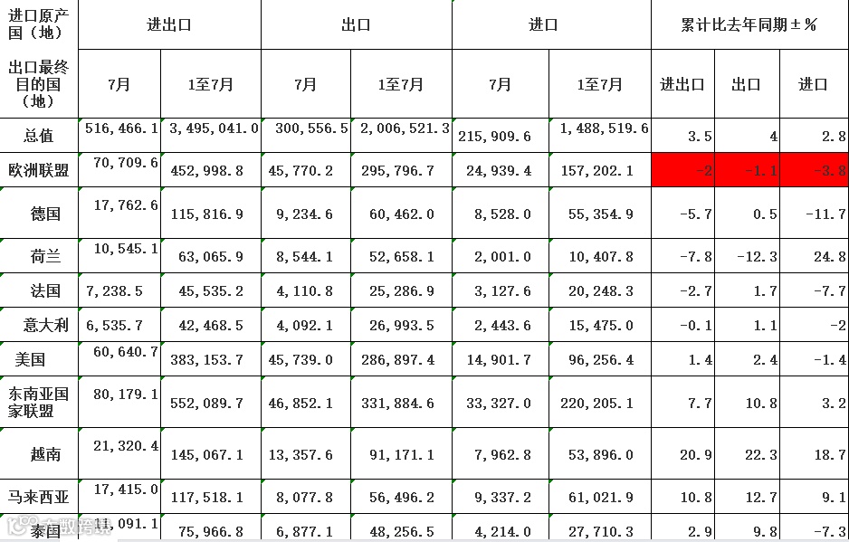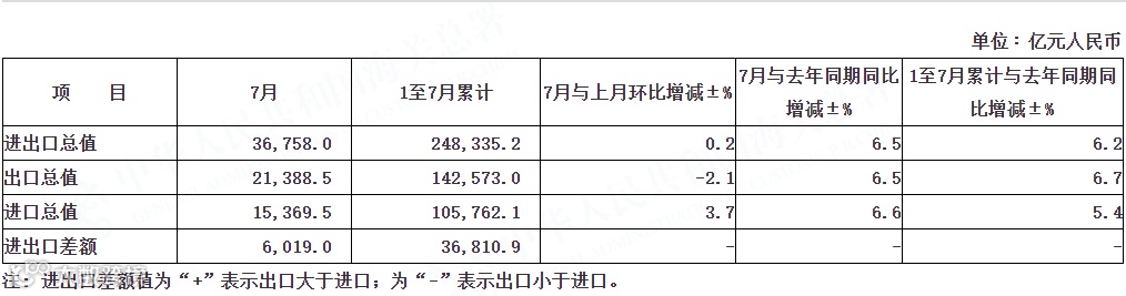 8月7日海关总署公布了前7个月最新的进出口数据。从数据上来看,外贸总体来说还是比较好的,1-7月出口增长了6.7%,进口增长了5.4%。7月份比6月份相比下降了2.1%,往年78月份是传统的外贸淡季,所以这个相对来说其实下降的不多,跟往年相比也是增长了6.7%的