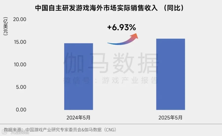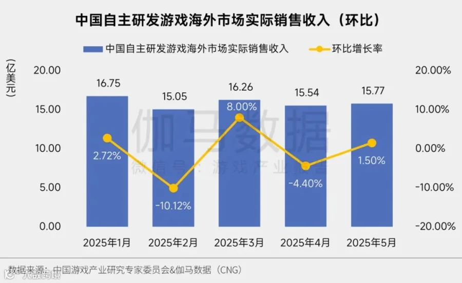 2025年5月,中国自主研发游戏海外市场实际销售收入为15.77亿美元,同比增长6.93%,环比增长1.50%,环比增量主要来自《Kingshot》《Genshin Impact》(原神)等。