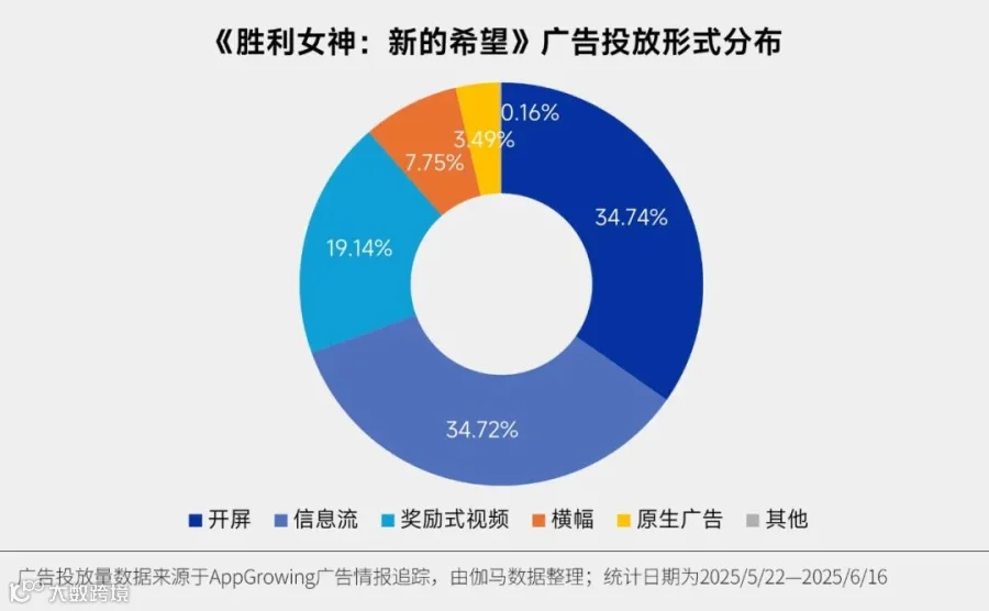 《胜利女神:新的希望》由韩国SHIFT UP公司开发,于5月22日上线国内市场,游戏广告投放量集中于上线当日;统计日期内,《胜利女神:新的希望》App Store游戏畅销榜排名在5月29日后呈下降趋势,而得益于6月10日推出的全新版本“记忆与遗忘” ,游戏于次日进入App Store游戏畅销榜TOP7。从游戏广告投放形式来看,游戏广告以开屏、信息流广告为主,两类广告合计占比达69.46%。