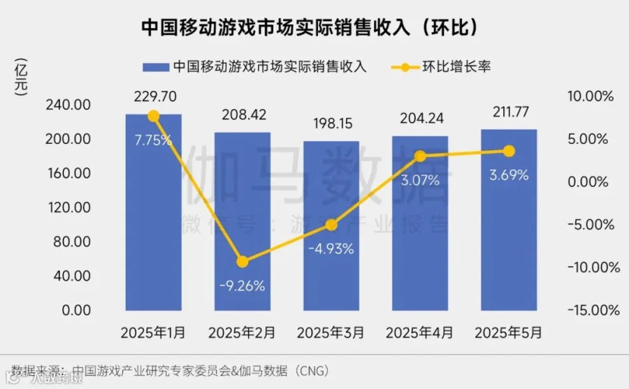 2025年5月,中国移动游戏市场规模为211.77亿元,同比增长11.96%,环比增长3.69% 。本月新品及成熟期产品中均有部分产品表现较佳。