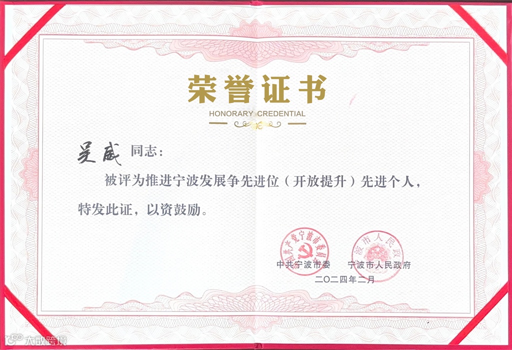 会上宣读了宁波市2023年获得中央和省级以上表彰表扬及通报肯定事项,对推进宁波发展争先进位、推进文明城市建设等做出贡献的先进集体和个人进行表彰。宁波捷时进出口有限公司董事长吴威荣获“推进宁波发展争先进位(开放提升工作)先进个人”称号。